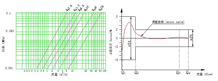 壓力損失曲線(xiàn) Pressure loss curve                                               示值誤差限與流量曲線(xiàn)FLOW-ERROR CURVE