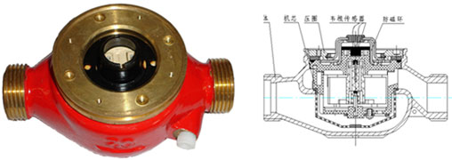 DS97TAR多流束有磁熱量表流量計的結構如圖,其工作原理是:熱水進(jìn)入流量計,經(jīng)進(jìn)水導向孔沖擊計量腔內的葉輪旋轉,再經(jīng)出水導向孔流出流量計。葉輪上面嵌有磁鋼隨葉輪旋轉,在隔板上端的韋根遠傳組件,接受葉輪旋轉的周期信號。其殼體采用優(yōu)質(zhì)黃銅,經(jīng)鑄造、數控機床和組合機床加工,機械強度好、尺寸精度穩定一致,塑料零件選用進(jìn)口的高強度耐熱工程塑料,密封件采用優(yōu)質(zhì)耐熱材料。因此,該流量計完全能夠適應國內供熱系統的惡劣工作環(huán)境。