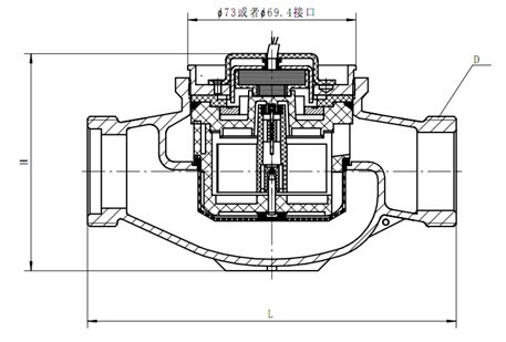 DS97TAR多流束有磁熱量表流量計的結構如圖,其工作原理是:熱水進(jìn)入流量計,經(jīng)進(jìn)水導向孔沖擊計量腔內的葉輪旋轉,再經(jīng)出水導向孔流出流量計。葉輪上面嵌有磁鋼隨葉輪旋轉,在隔板上端的韋根遠傳組件,接受葉輪旋轉的周期信號。其殼體采用優(yōu)質(zhì)黃銅,經(jīng)鑄造、數控機床和組合機床加工,機械強度好、尺寸精度穩定一致,塑料零件選用進(jìn)口的高強度耐熱工程塑料,密封件采用優(yōu)質(zhì)耐熱材料。因此,該流量計完全能夠適應國內供熱系統的惡劣工作環(huán)境。